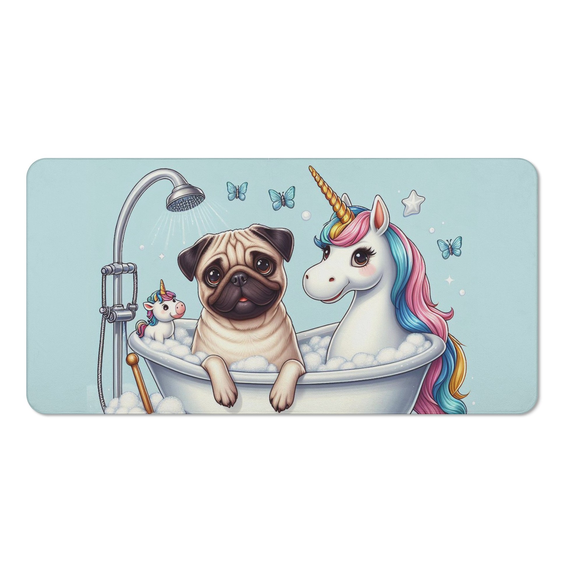 Do you love pugs and unicorns? Then this bath towel is perfect for you! This towel features a cute and colorful scene of a pug dog with a unicorn in a bathtub, surrounded by hearts and bubbles. It will brighten up your bathroom and make your bathing time more fun and relaxing.