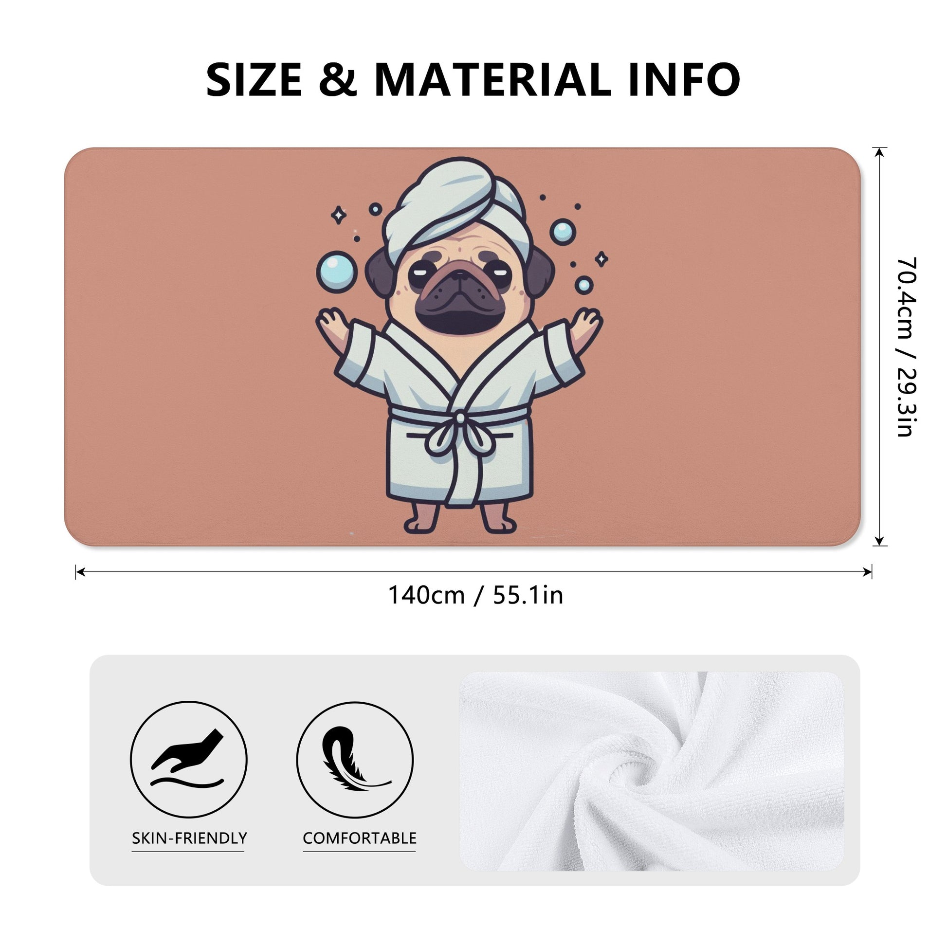 Do you love pugs and unicorns? Then this bath towel is perfect for you! This towel features a cute and colorful scene of a pug dog with a unicorn in a bathtub, surrounded by hearts and bubbles. It will brighten up your bathroom and make your bathing time more fun and relaxing.