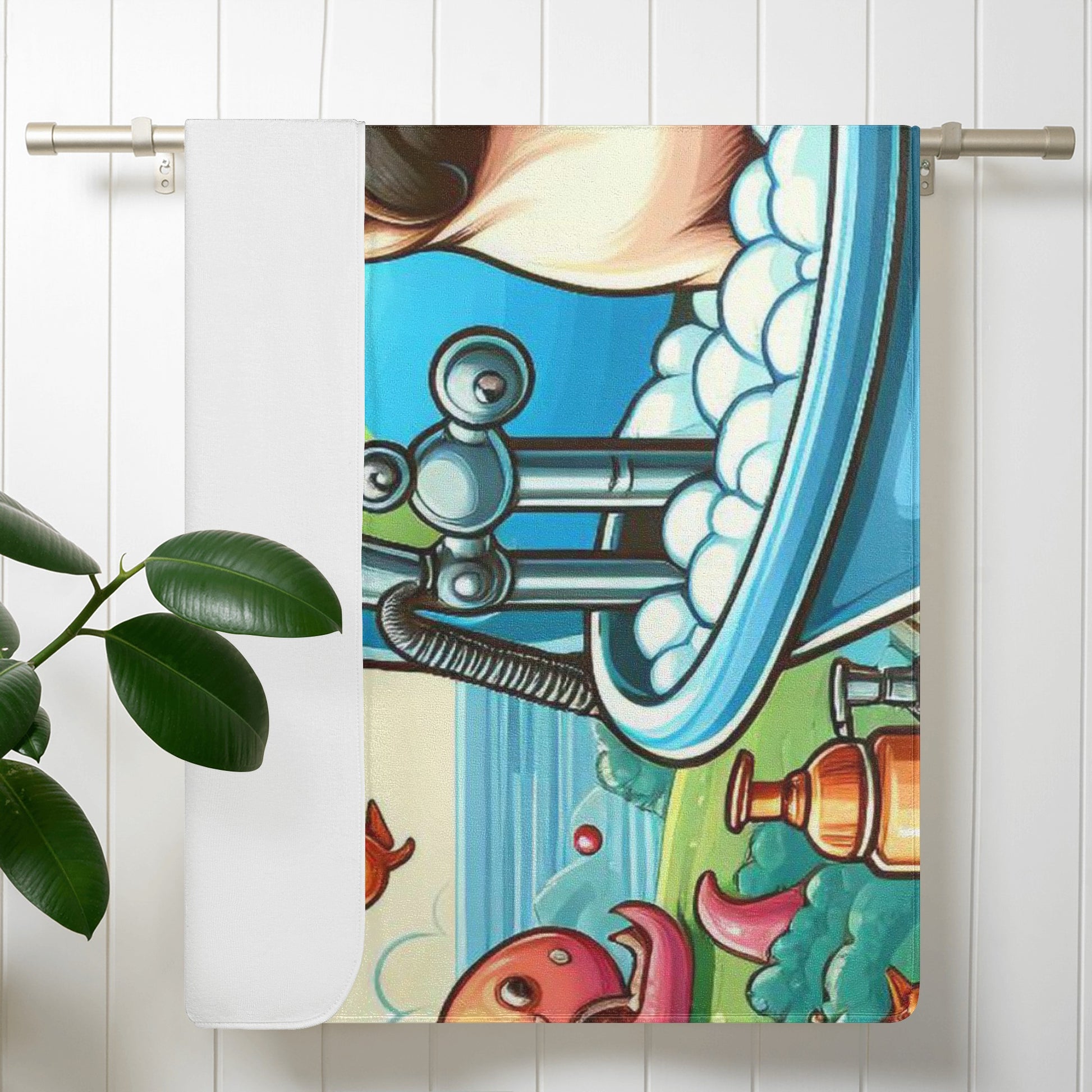 Do you love pugs and unicorns? Then this bath towel is perfect for you! This towel features a cute and colorful scene of a pug dog with a unicorn in a bathtub, surrounded by hearts and bubbles. It will brighten up your bathroom and make your bathing time more fun and relaxing.