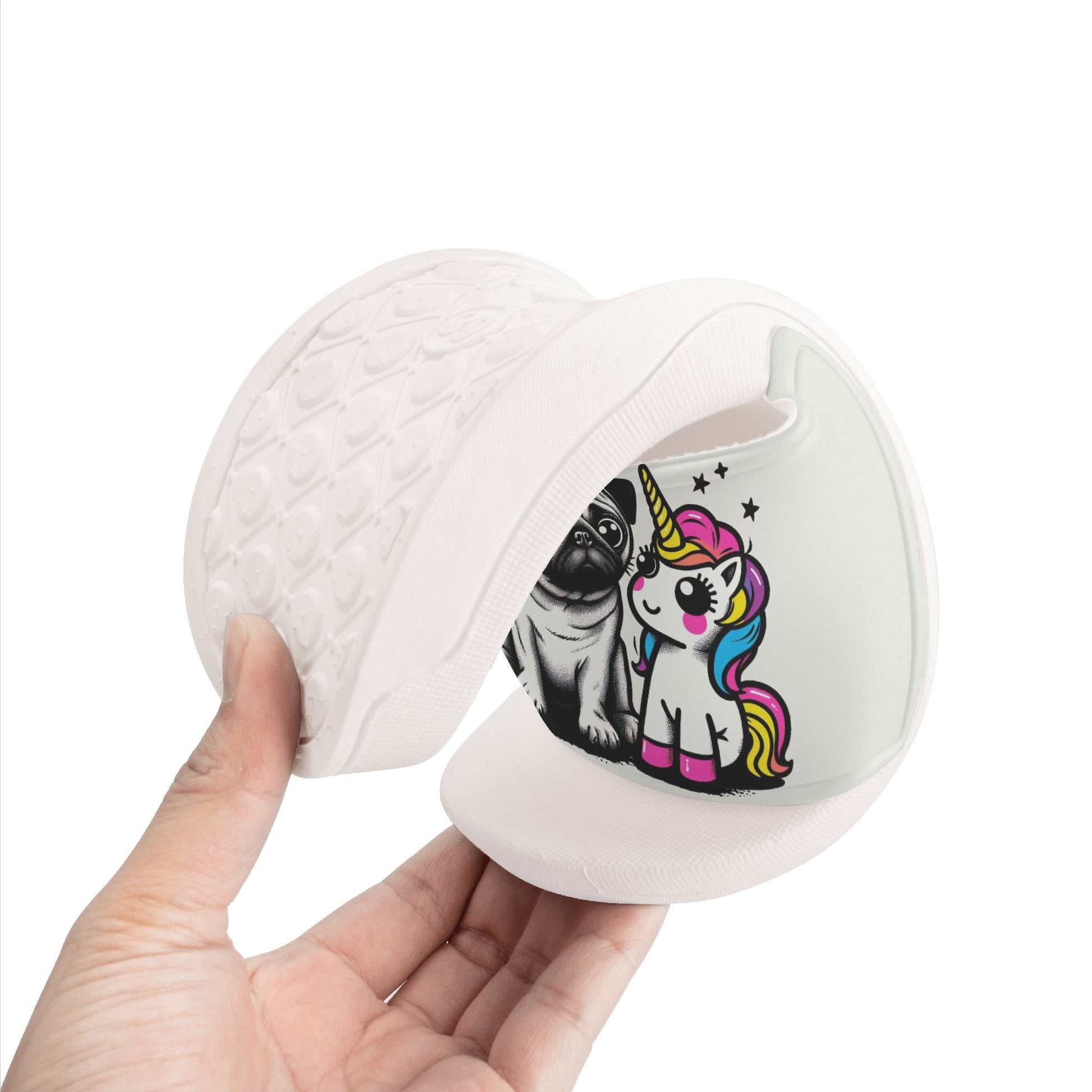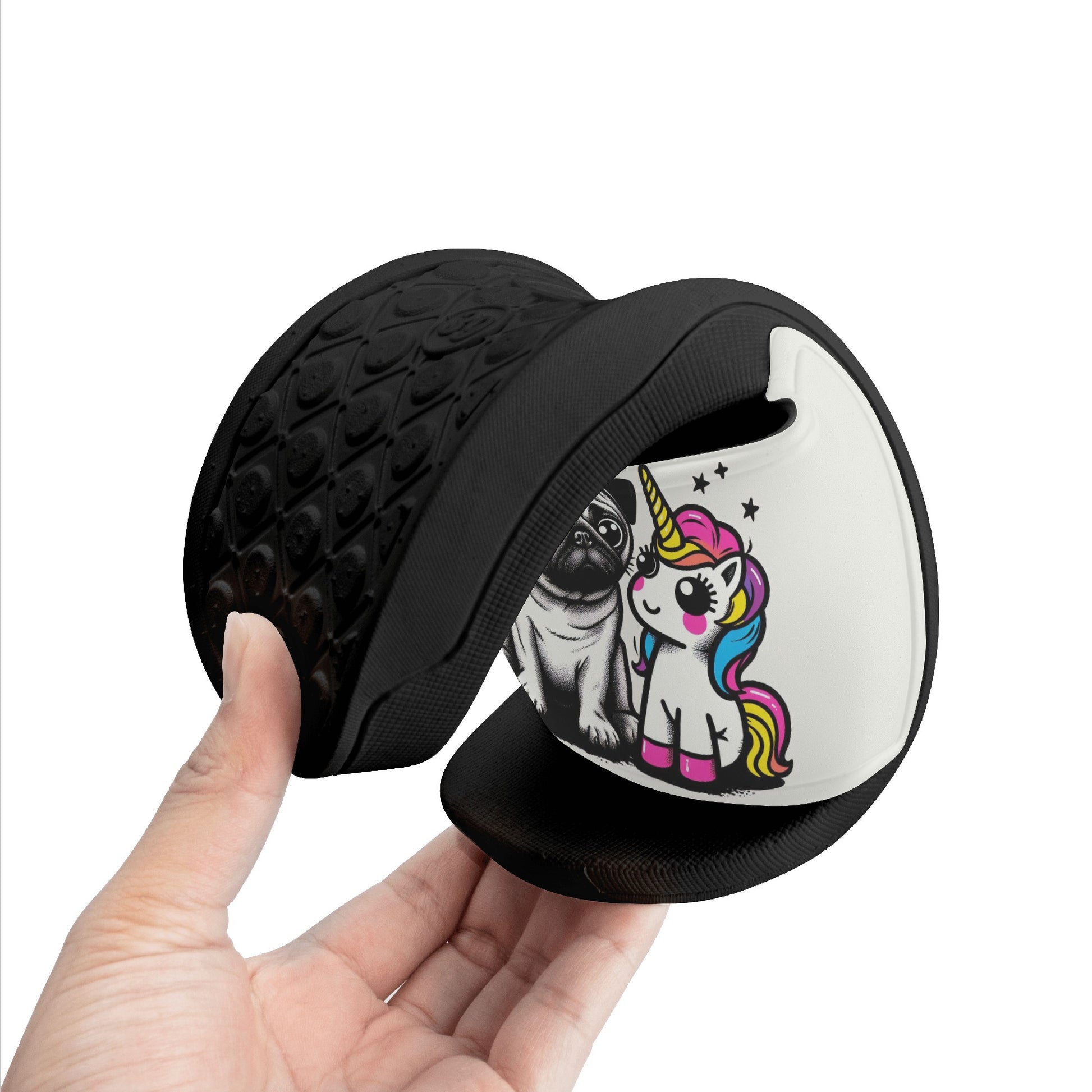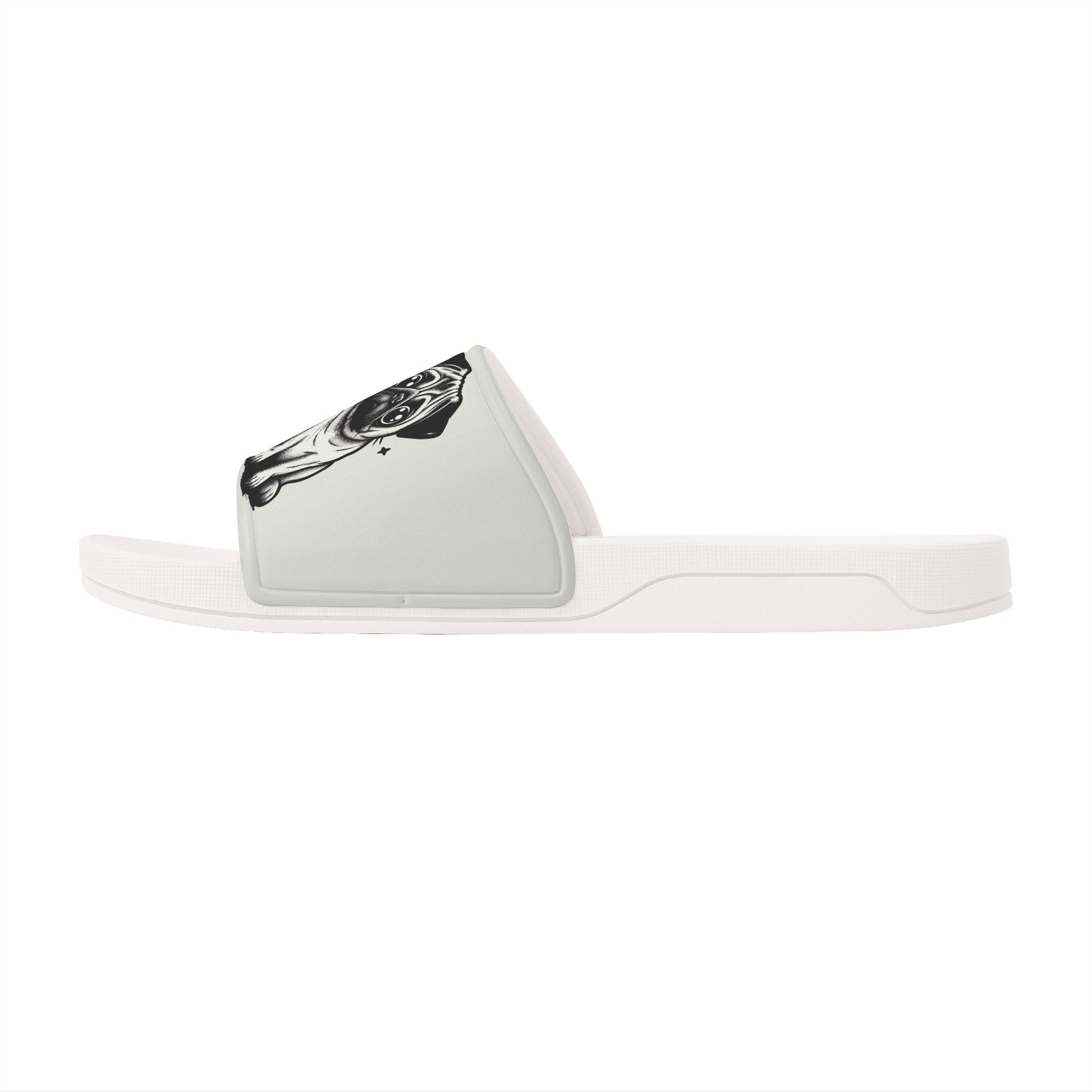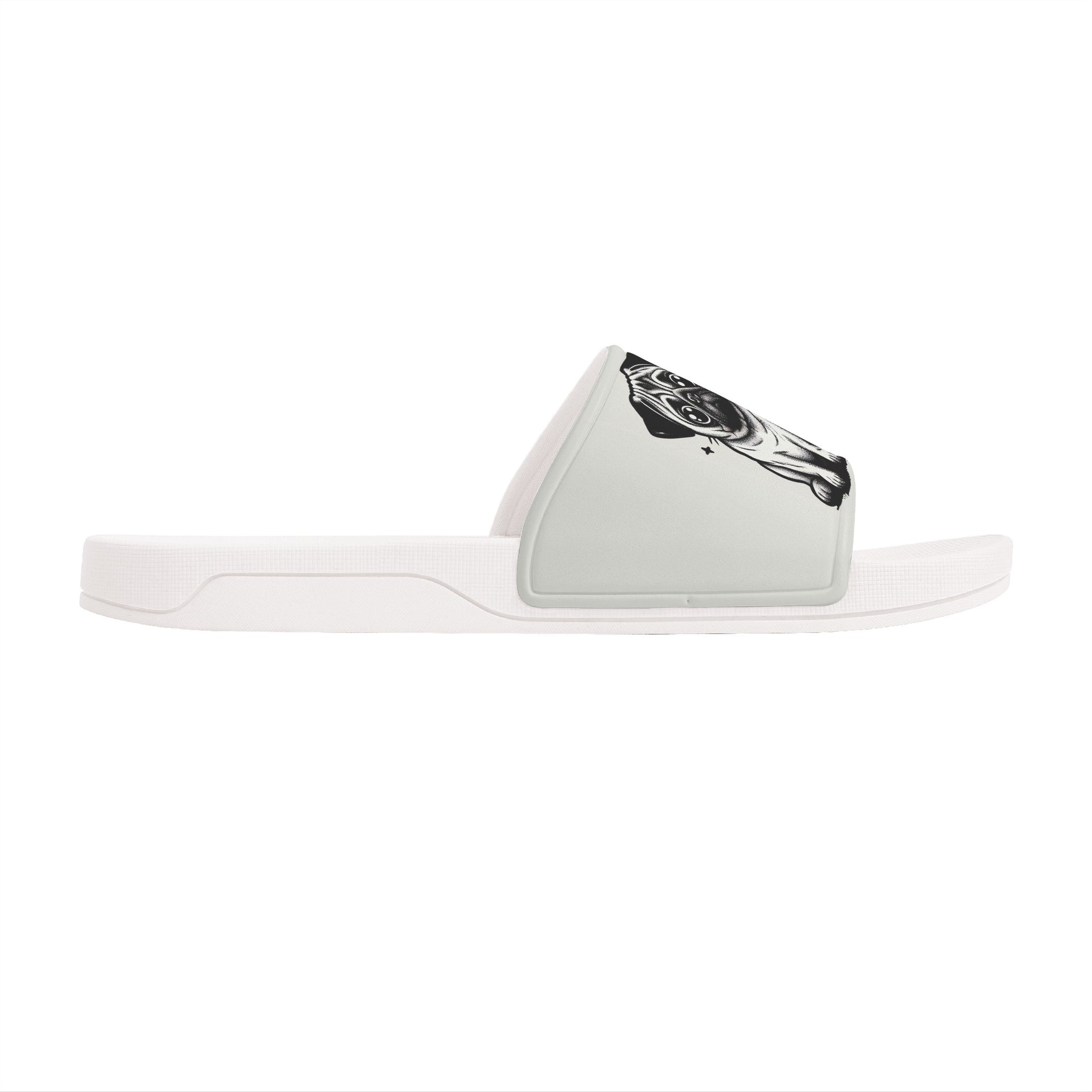 Unleash your love for pugs with our custom printed slide sandals, featuring an open toe and flat heel style for ultimate comfort. Here's what makes them special: