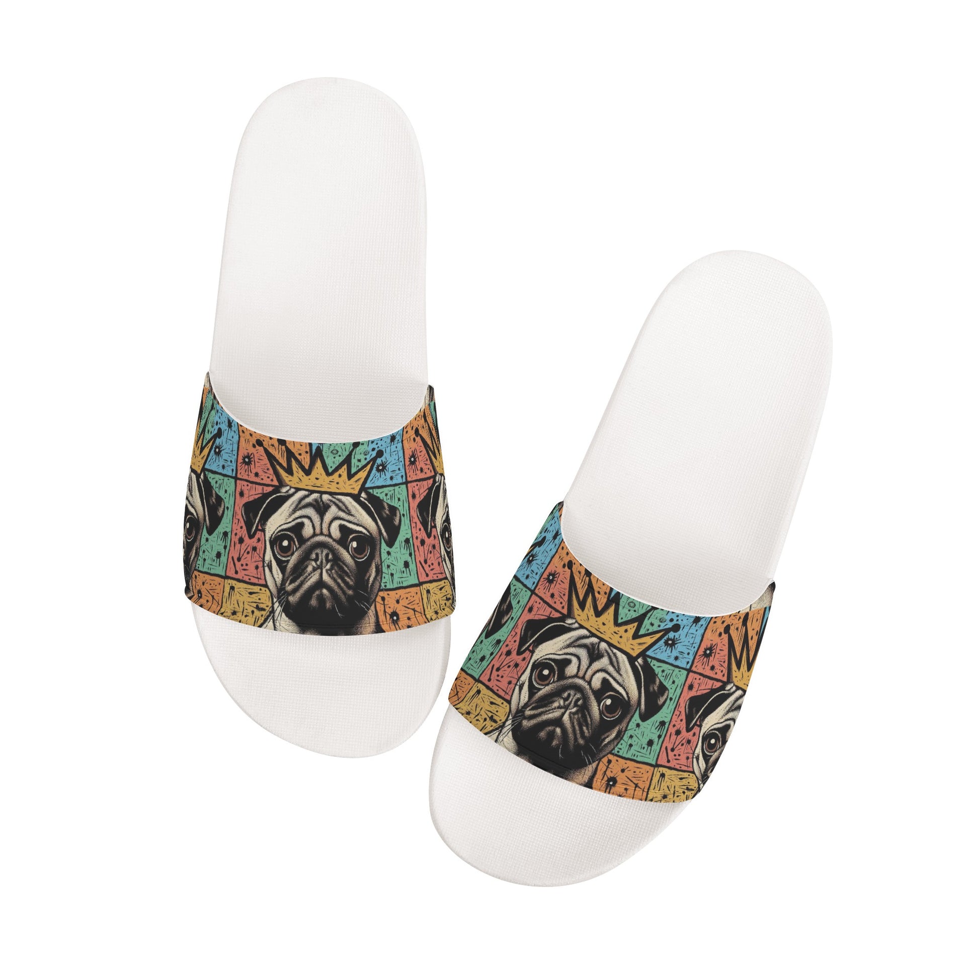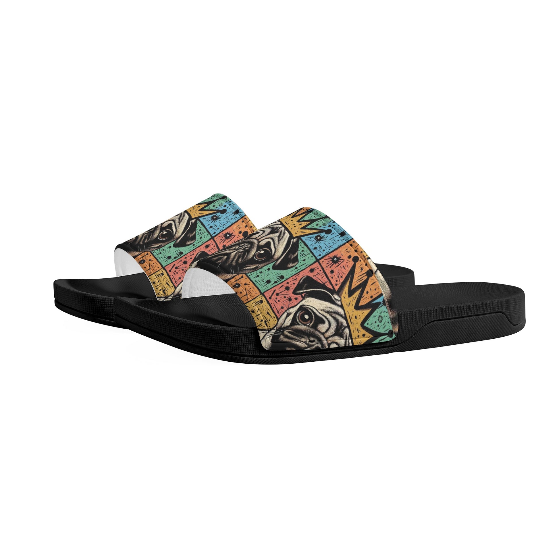 Unleash your love for pugs with our custom printed slide sandals, featuring an open toe and flat heel style for ultimate comfort. Here's what makes them special: