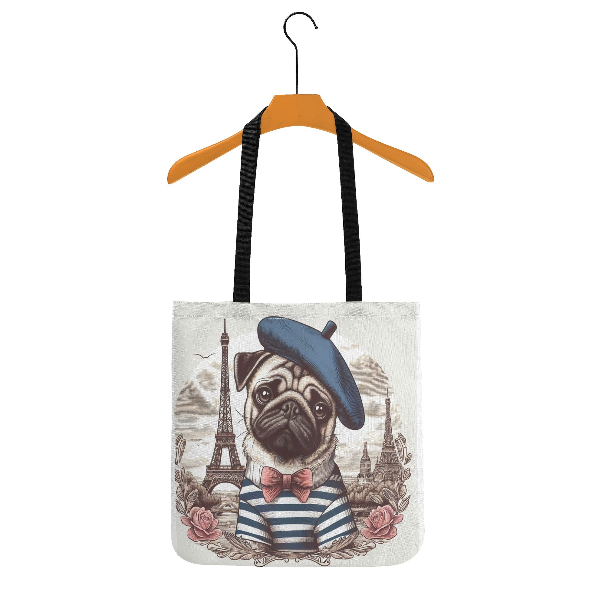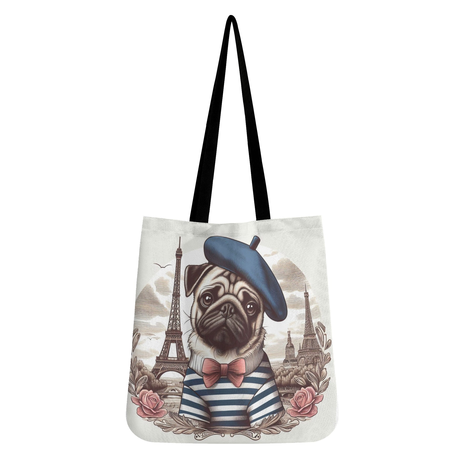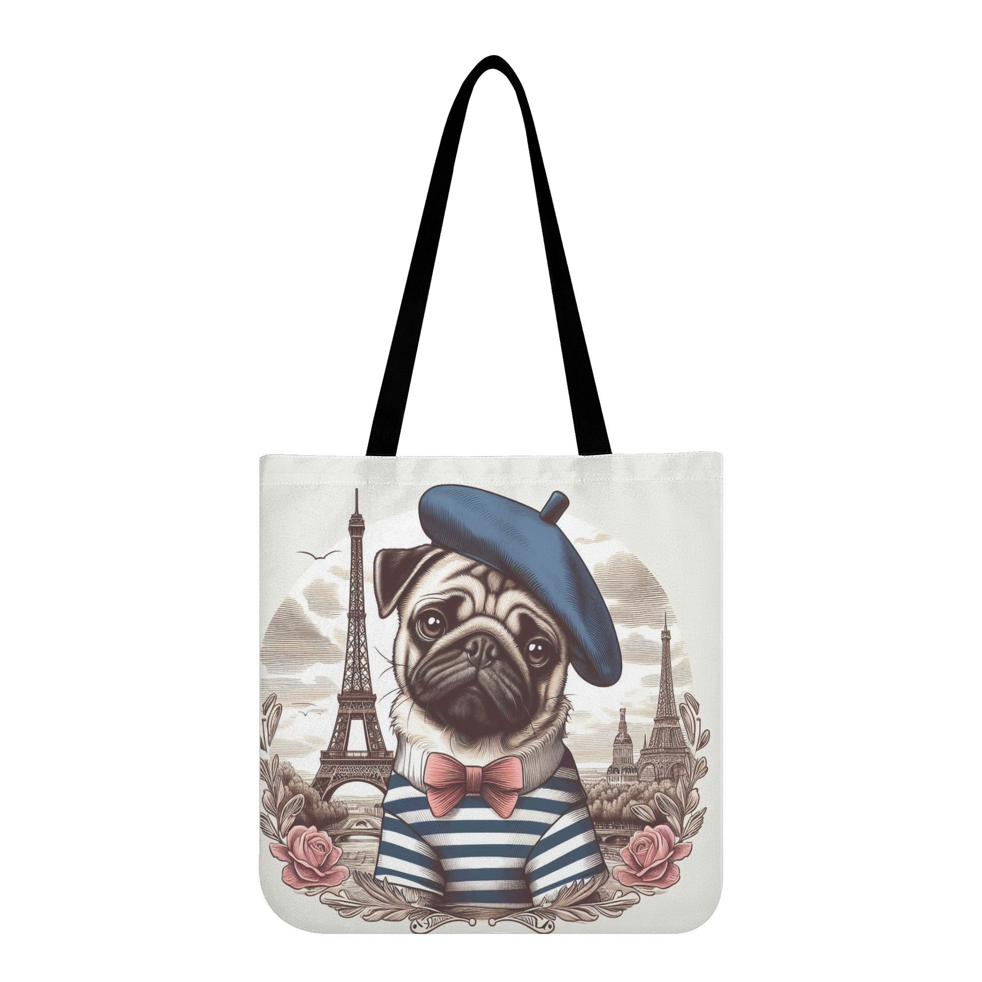 This all-over print tote bag is a versatile and stylish accessory that can complement any outfit. You can use it as a book bag, grocery bag, shopping bag, or everyday bag. It is also a great gift idea for any pug dog lover in your life.